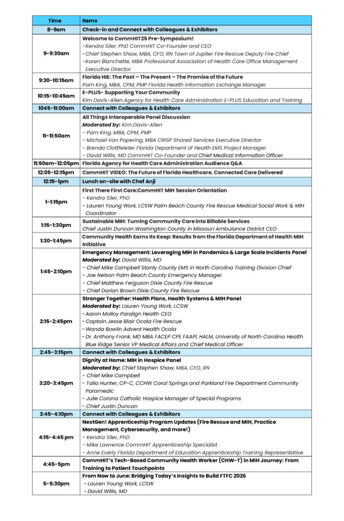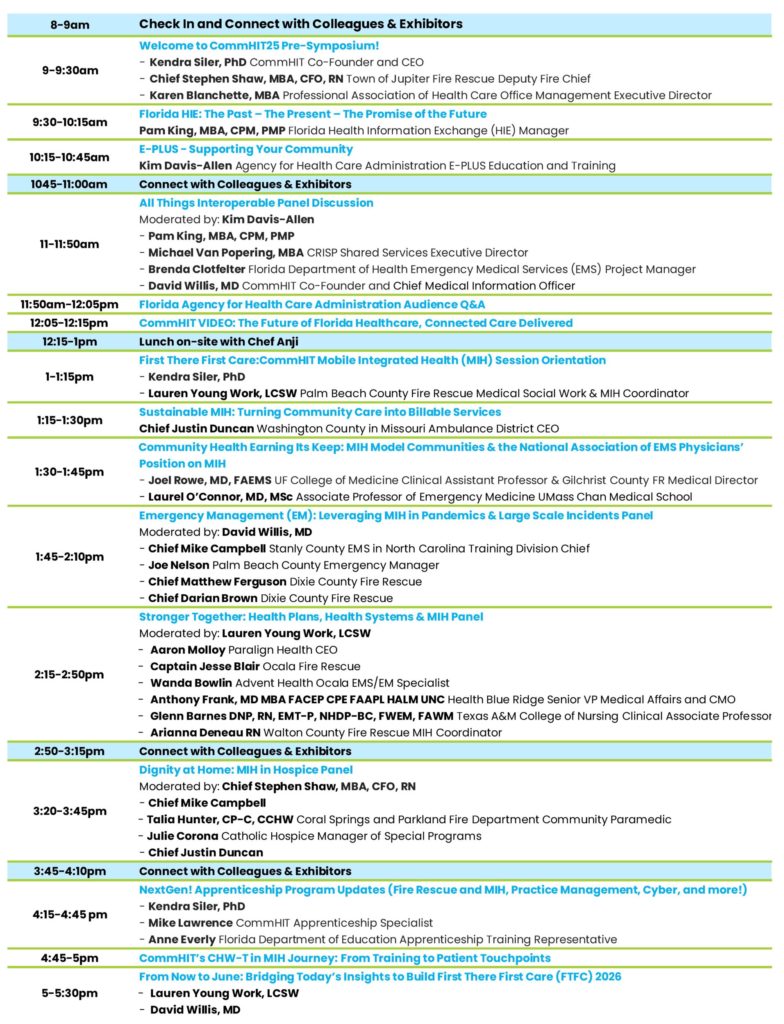 This year, CommHIT is proud to announce that the CommHIT25 Pre-Symposium will be jointly presented by the Florida Agency for Health Care Administration (AHCA) in the morning and First There First Care (FTFC) in the afternoon. With the combination of AHCA and FTFC—and CommHIT serving as the foundational convener—the statewide Fire Rescue, Emergency Management (EM) and Mobile Integrated Health (MIH) ecosystem will be joined by the broader healthcare delivery system—bringing together hospitals, health insurance plans, Medicaid providers, federally qualified health centers (FQHCs), hospices, nursing facilities, behavioral health centers, and practice managers. For Florida, we must all be connected partners in health!
