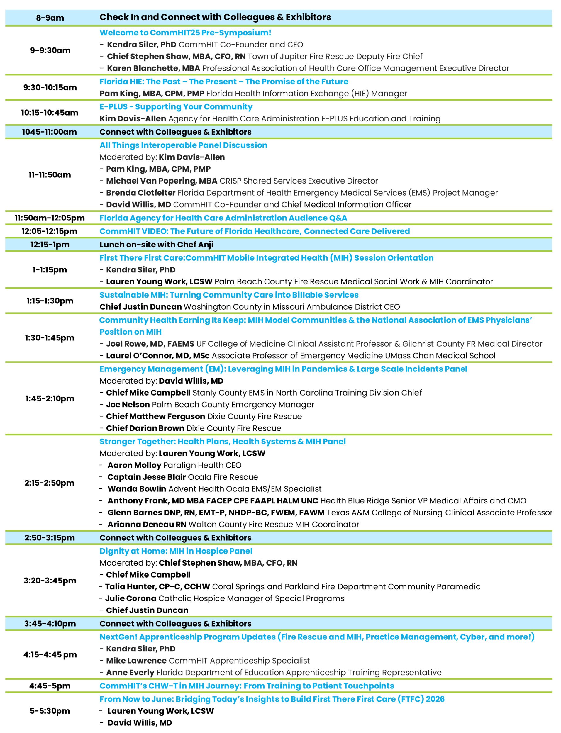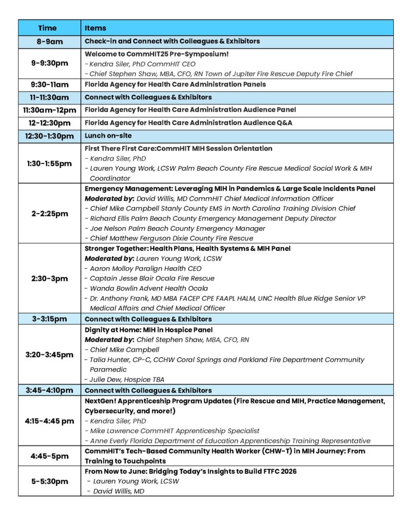 This year, CommHIT is proud to announce that the CommHIT25 Pre-Symposium will be jointly presented by the Florida Agency for Health Care Administration (AHCA) in the morning and First There First Care (FTFC) in the afternoon. With the combination of AHCA and FTFC—and CommHIT serving as the foundational convener—the statewide Fire Rescue, Emergency Management (EM) and Mobile Integrated Health (MIH) ecosystem will be joined by the broader healthcare delivery system—bringing together hospitals, health insurance plans, Medicaid providers, federally qualified health centers (FQHCs), hospices, nursing facilities, behavioral health centers, and practice managers. For Florida, we must all be connected partners in health!